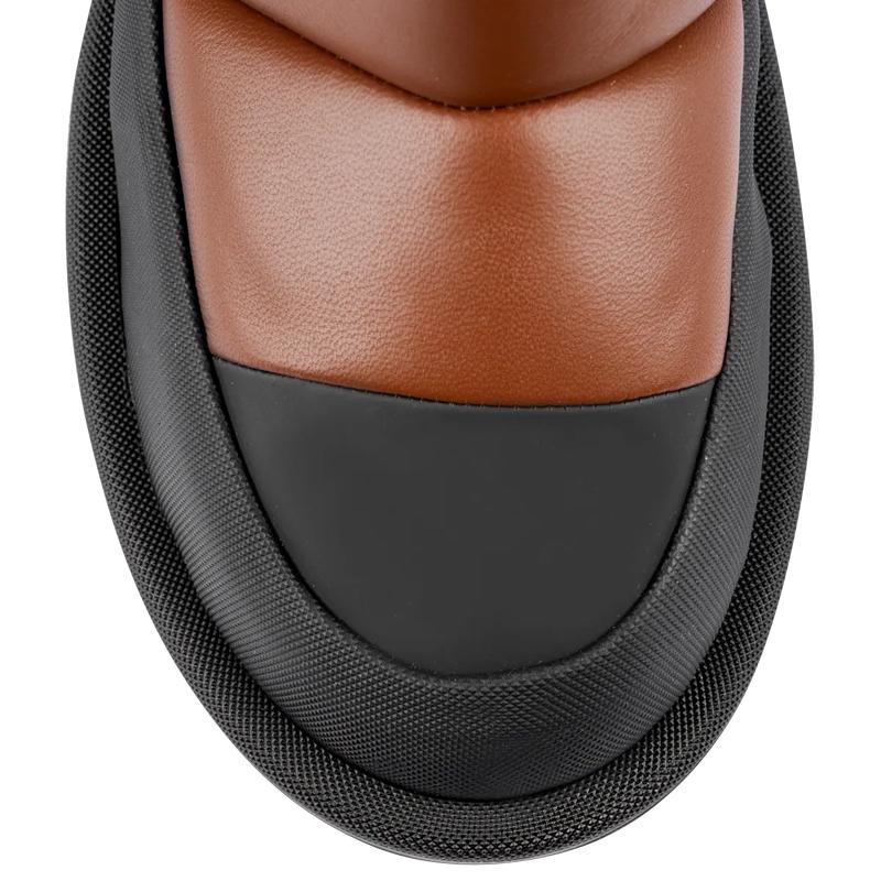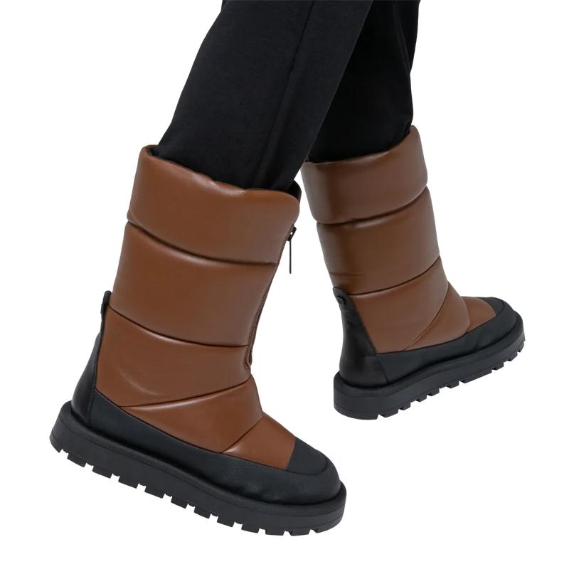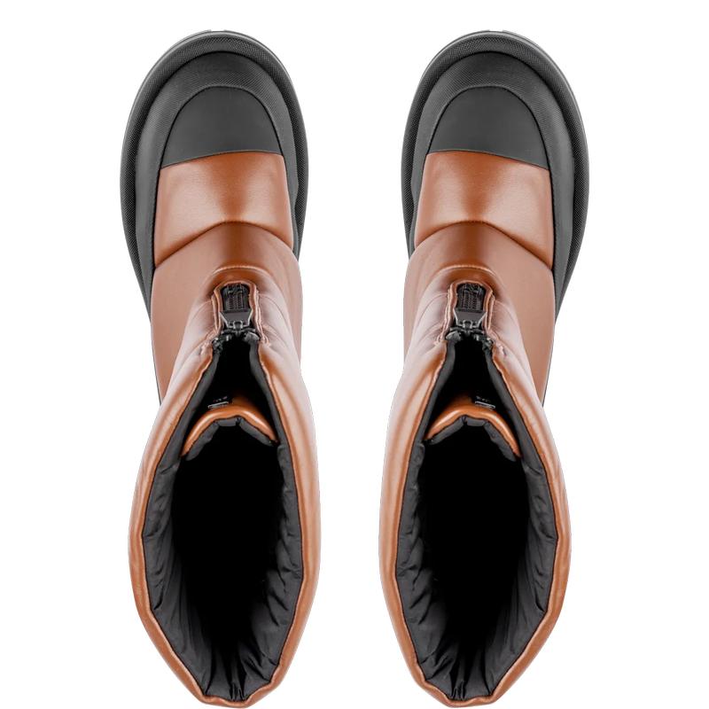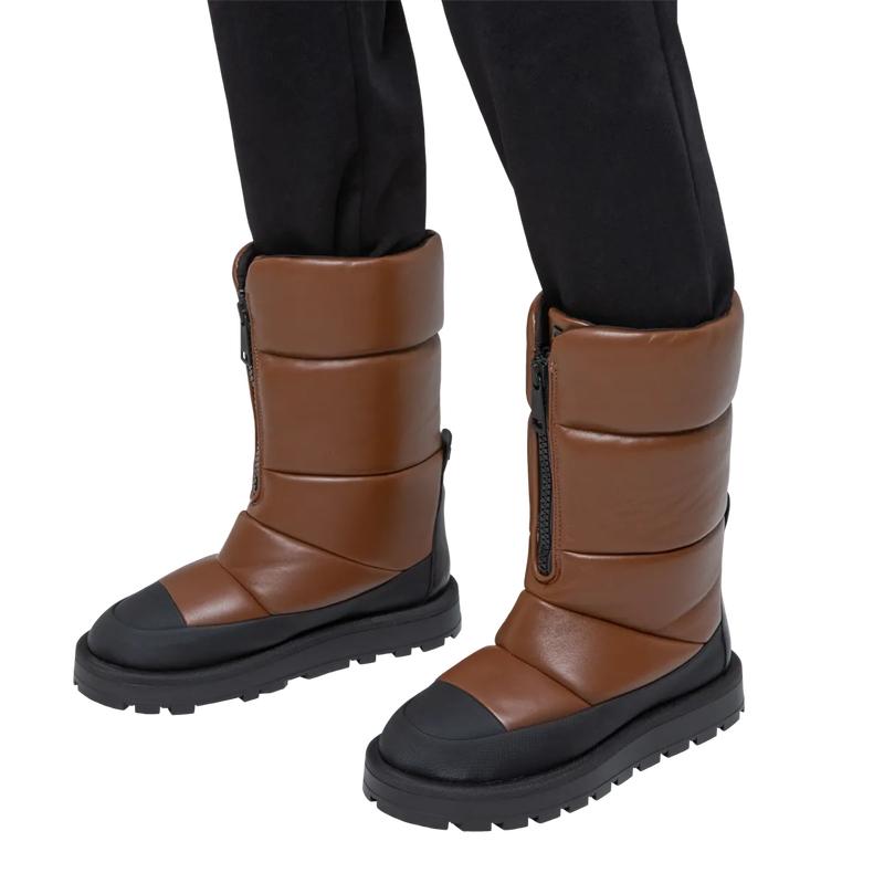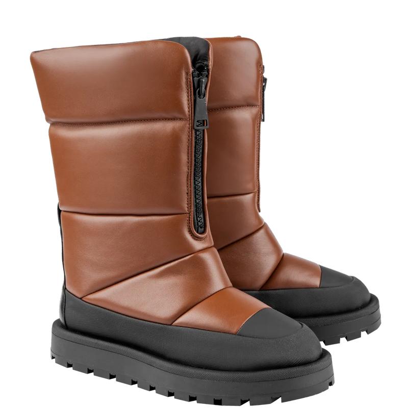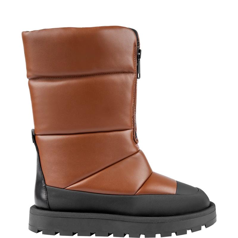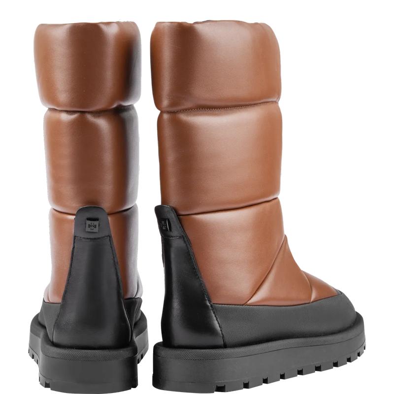 Подыскиваете стильную обувь, чтобы пережить зимнюю непогоду? Тёплые кожаные сапоги с подкладкой из уютного и мягкого овечьего меха пригодятся не только на горнолыжном курорте – геометричный стёганый силуэт модели также идеально подойдёт для города, особенно в комбинации с пальто из эко меха или объёмным пуховиком.