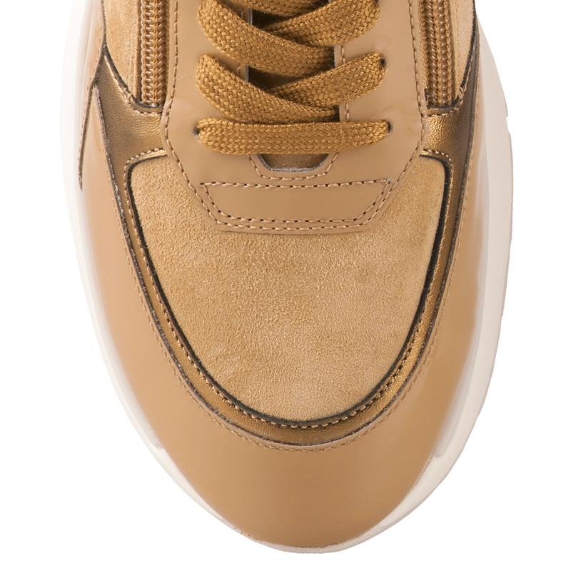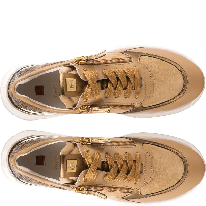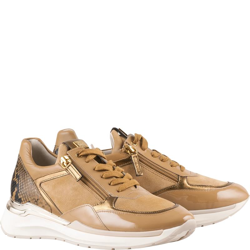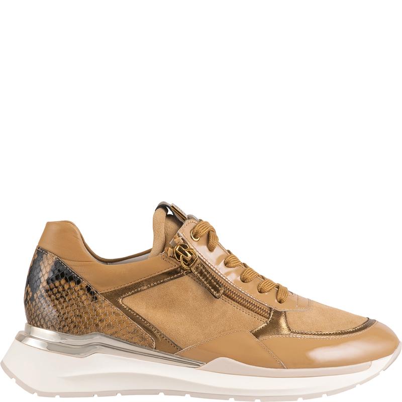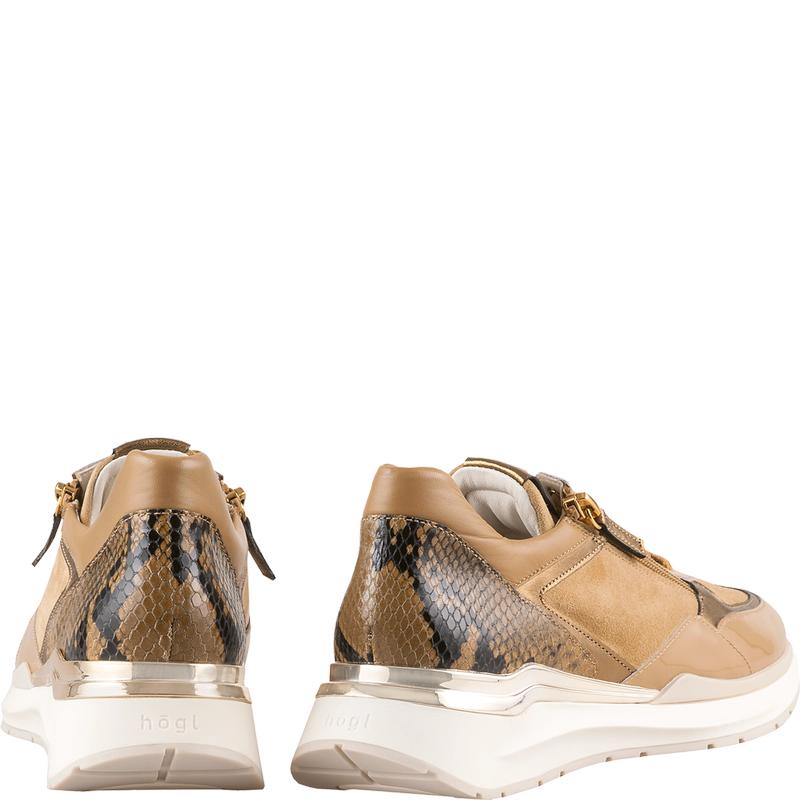 Необычная, но крайне гармоничная комбинация материалов внесёт разнообразие в повседневные образы. Кожаные кроссовки, изготовленные этичными методами на экологически безопасном производстве, придутся особенно по вкусу любительницам коричневых оттенков. Вставка в области пятки из кожи со змеиным тиснением, а также серебристые декоративные элементы идеально сочетаются друг с другом, выводя эту спортивную модель в модный авангард.