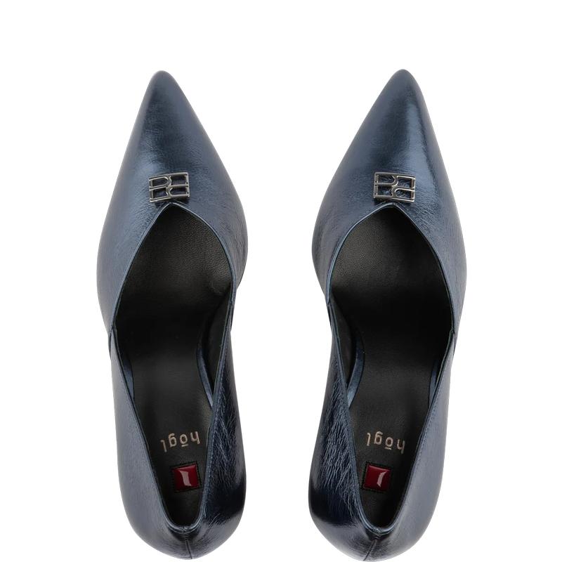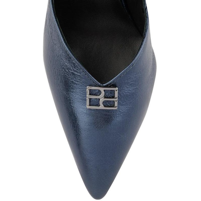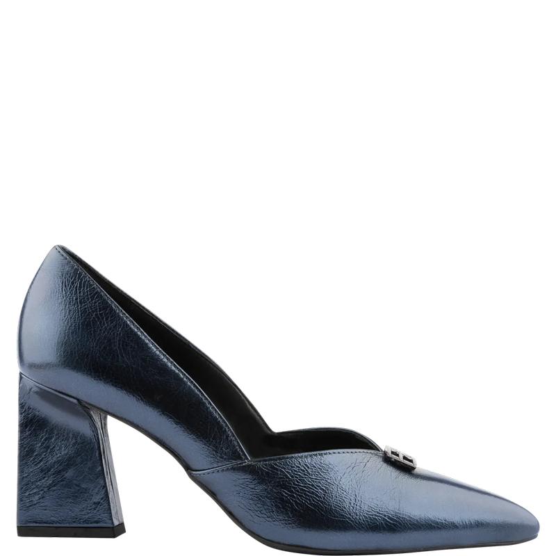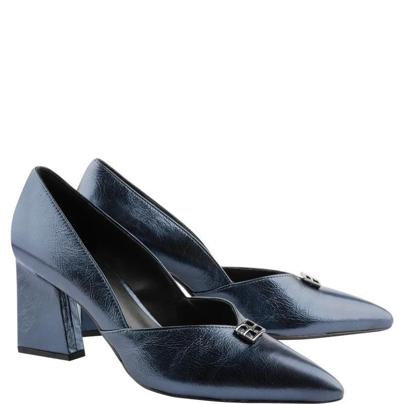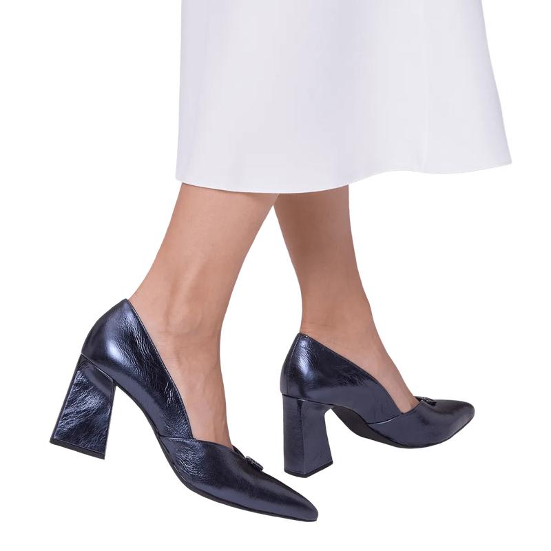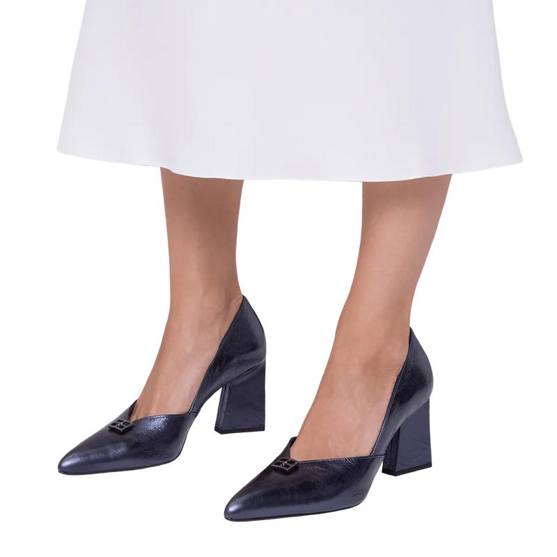 Классика с «изюминкой»! Лодочки на каблуке ROMY, выполненные из мерцающей металлизированной кожи тёмных оттенков, станут стильным дополнением к женственным нарядам – как днём, так и ночью. Скульптурный блочный каблук и элегантный V-образный вырез визуально стройнят и удлиняют ноги.