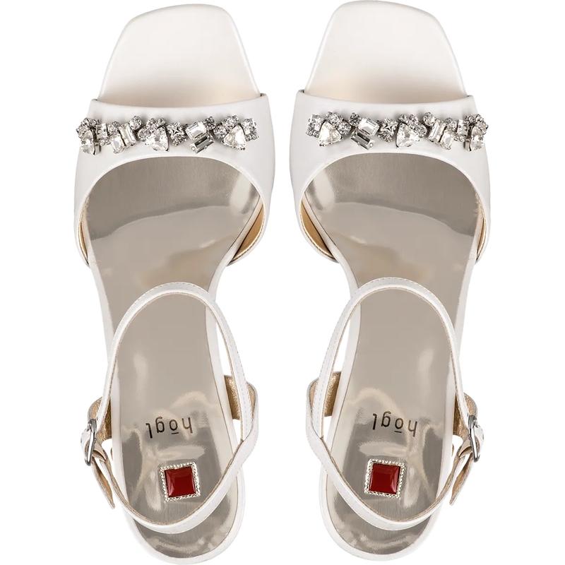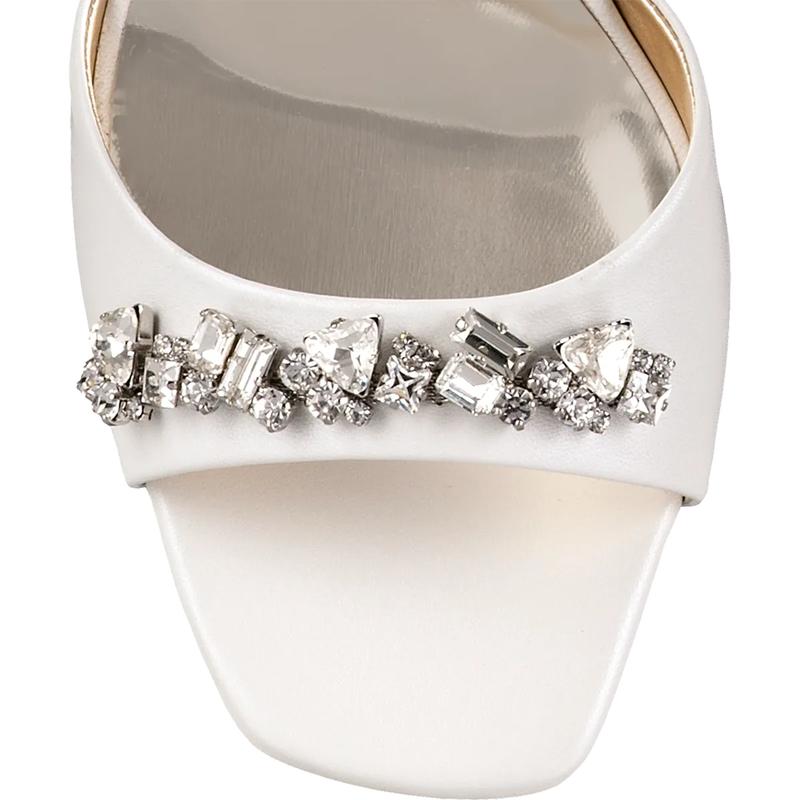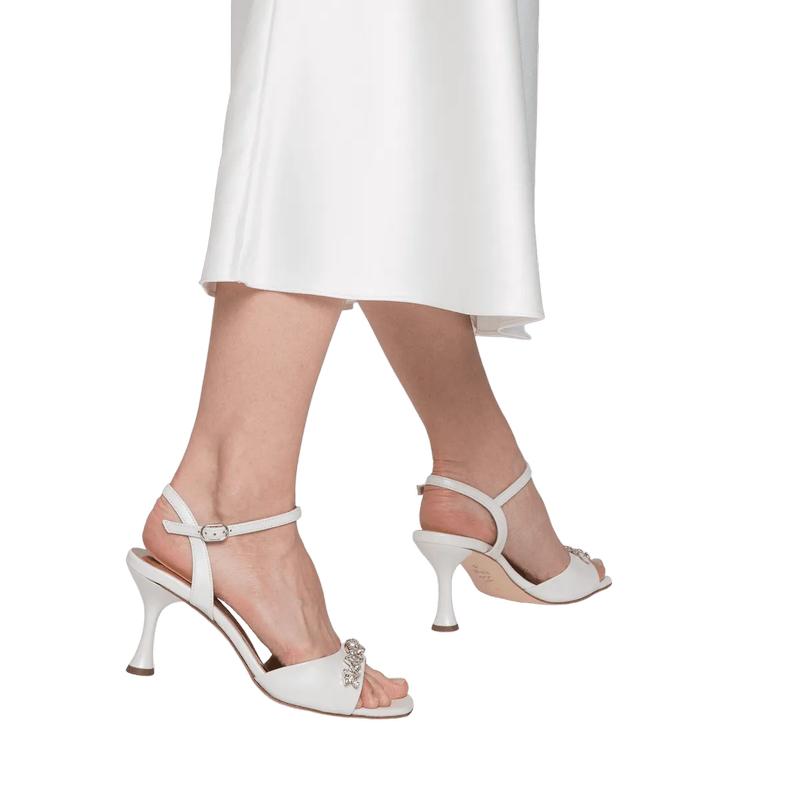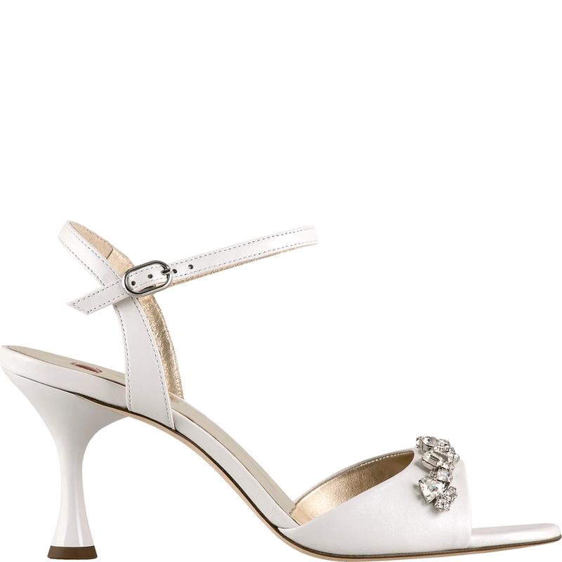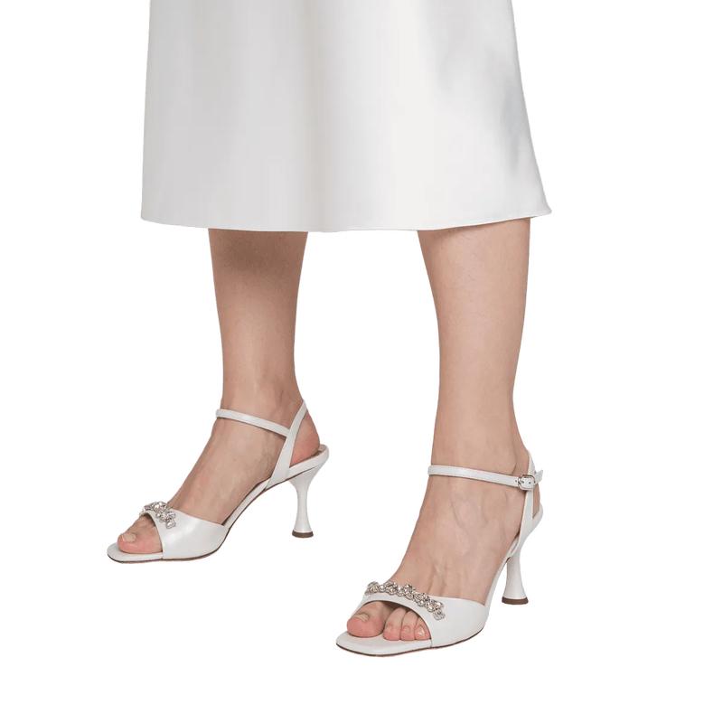 Изящество этой белой модели на шпильке пришлось по вкусу не только невестам. Шелковистое сияние босоножек, изготовленных из этичных и экологически чистых материалов, великолепно сочетается с летними платьями и вечерними нарядами. Изогнутый каблук и роскошная декоративная пряжка подчёркивают женственную элегантность этой великолепной пары.